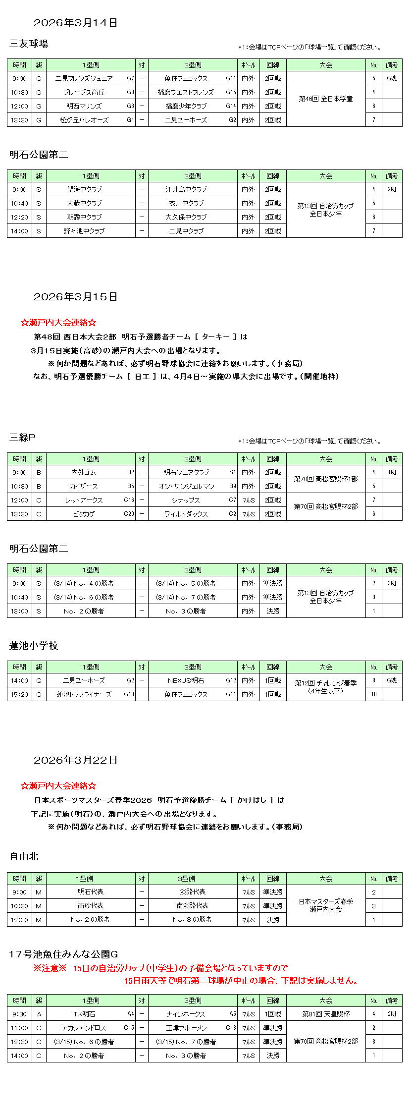 試合予定 2026年 3月14日・15日/22日 ○試合当日、参加者の検温と健康状態確認のこと ○ベンチ内での密着を避け、 距離を保てないようであればベンチを外野側へ広げる ○マスクをしていない状態の近距離での円陣や声かけは 極力避ける ○試合後のグラウンド整備は、ご協力をお願いします